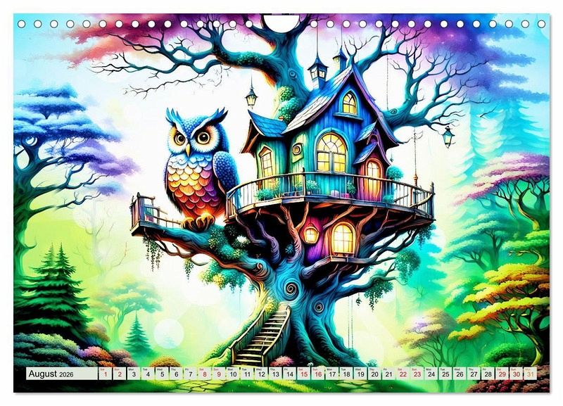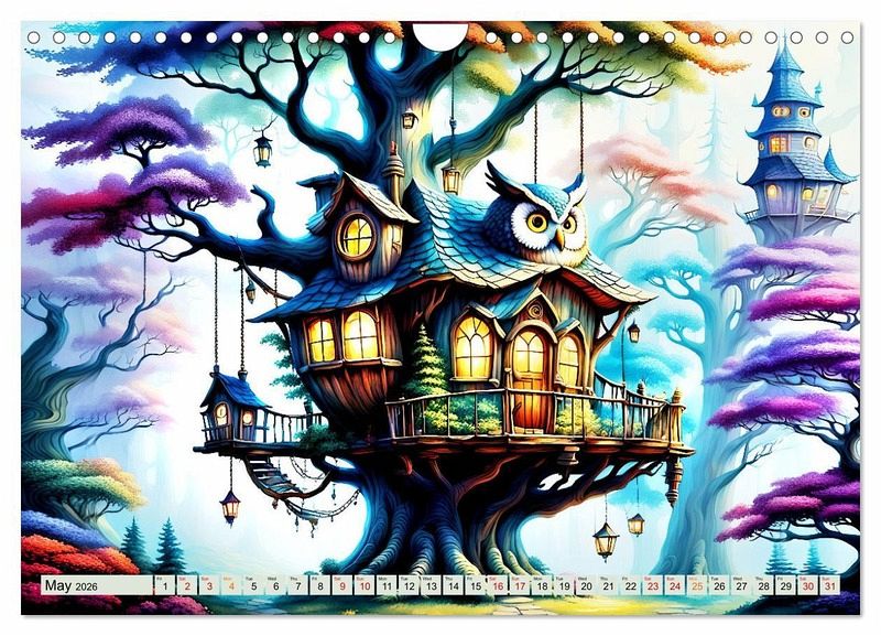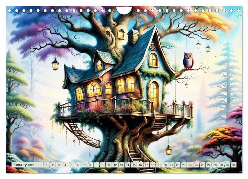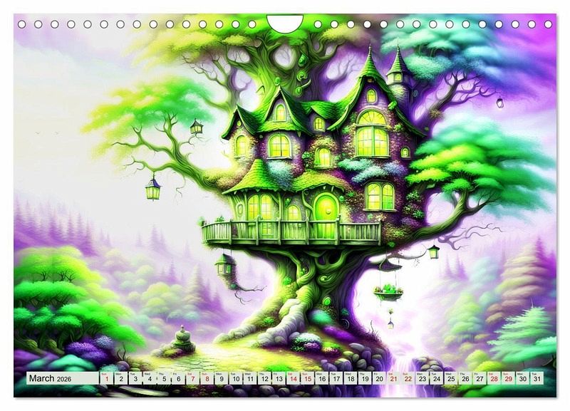 Discover magical, unusual tree houses hidden among the canopies of leaves and experience an imaginative and colourful year created with artificial intelligence. Every month you will see a tree house where nature is in perfect harmony. Enjoy a tree house every day, drawn with many enchanting details.