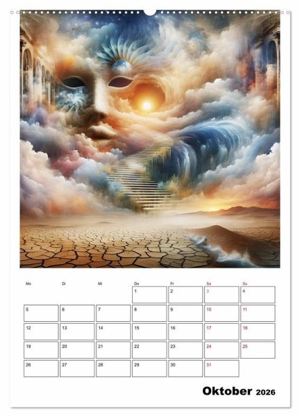 Tauchen Sie ein in eine Welt der Träume und Illusionen mit unserem exklusiven Kalender, der von Künstlicher Intelligenz erschaffen wurde. Lassen Sie sich Monat für Monat von atemberaubenden Bildern verzaubern, die eine majestätische Treppe inmitten ausgetrockneter Natur zeigen, welche Sie zu faszinierenden Illusionen und surrealen Szenarien führt. Jeder Schritt auf dieser Treppe eröffnet ein neues Fenster in eine Welt, die Sie so noch nie gesehen haben.