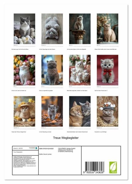 Tauche ein in die Welt der eleganten Britisch Kurzhaar Katzen! Unser exklusiver Kalender "Treue Wegbegleiter" begleitet dich Monat für Monat mit wunderschönen Aufnahmen dieser sanften und majestätischen Katzen. Ihre treue und gelassene Natur macht sie zu wahren Seelenfreunden - genau wie dieser Kalender, der dein Zuhause das ganze Jahr über verschönern wird. Alle hier gezeigten Bilder wurden mit Sorgfalt, Liebe und mit Hilfe einer KI generiert. Abschließend werden sie mit Bildbearbeitungsprogrammen überarbeitet und in den Kalender eingefügt.