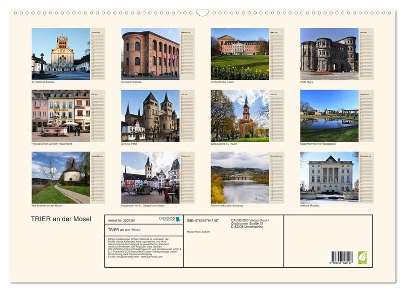 QUALITÄT - Hochwertiger Fotokalender mit 12 wunderschönen Motiven auf lichtbeständigem Bilderdruckpapier, robuste Spiralbindung mit Aufhängebügel.NACHHALTIG - deutliche Abfallreduzierung durch bedarfsgerechte Einzelstückfertigung, umweltfreundliches FSC-zertifiziertes Papier, Produktion in Deutschland, klimabewusste Logistik.PERFEKTES GESCHENK - Kalender für Freunde und Familie, für Kinder und Erwachsene, jung und alt, zu Weihnachten, Geburtstag oder zwischendurch.VIELFALT - Bildkalender in verschiedenen Formaten, z.B. DIN A5, DIN A4, DIN A3 sowie DIN A2. Ob Naturmotiv, Gemälde oder Fotos, ideal für ein persönliches Wohlfühlambiente.Augusta Treverorum, das heute Trier wurde vor mehr als 2000 Jahren gegründet . Die Baudenkmäler und steinerne Zeugen aus der Vergangenheit machen Trier zu einem beliebten Reiseziel für Gäste aus aller Welt . von Autor(in): Marion Reiß - Seibert