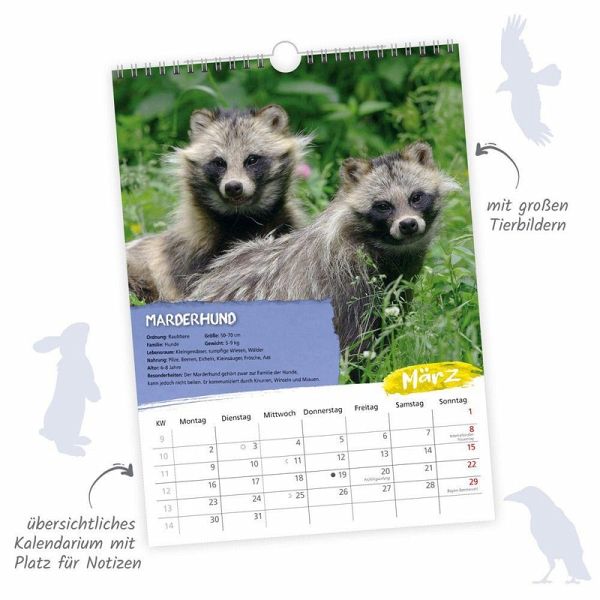 Im Wald, am Feldrand oder im Park um die Ecke - unsere heimische Tierwelt umgibt uns zu jeder Zeit und bleibt dabei oft unbemerkt. Der dekorative Wandkalender Heimische Tierwelt im Format 24 x 33 cm mit seinen herrlichen Fotos von 12 allbekannten Wald- und Wiesenbewohnern rückt die Natur in den Fokus und wartet mit zusätzlichen, spannenden Informationen zu den einzelnen Tieren in jedem Monat auf. Dank gut ablesbaren Kalendariums, markierter Feiertage, Mondphasen und Platz für Notizen hilft der Kalender außerdem ganz wunderbar beim Organisieren des Alltags. Das perfekte Geschenk für alle naturverbundenen Tierfreunde!