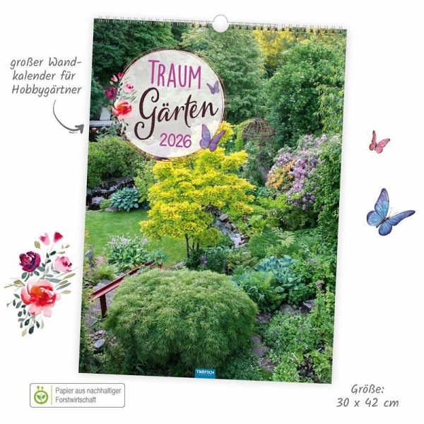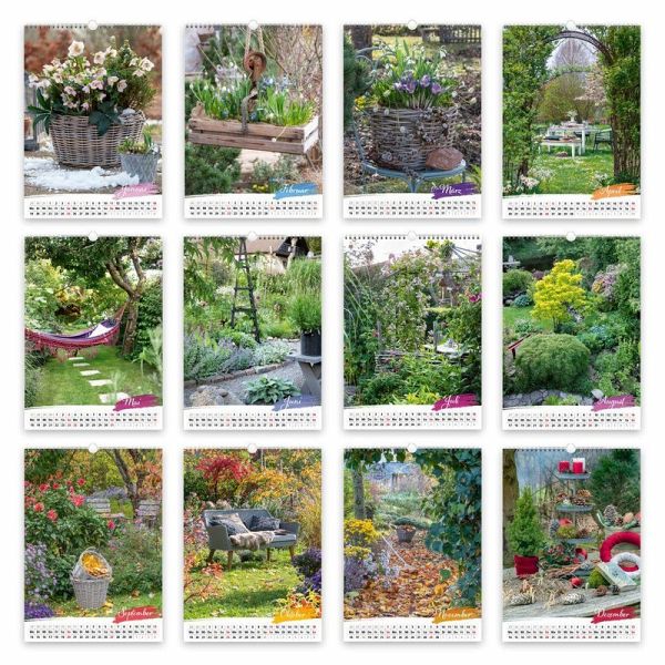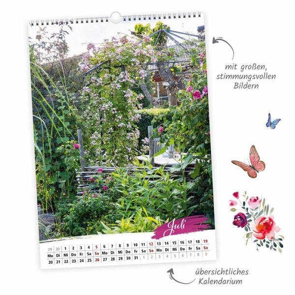 Die Schönheit der Natur ist nicht nur eine Wohltat für Augen und Seele, sie ist auch ein Schlüssel zu mehr Lebensfreude. Lassen wir uns also verzaubern vom Lächeln der Natur in seiner schönsten Form, der Gartenkunst! Unser dekorativer Großbild-Wandkalender TRAUMGÄRTEN im Format 34 x 48 cm entführt in zwölf zauberhafte Traumgärten, die in den eigenen vier Wänden oder im Büro Monat für Monat aufs Neue farbenfrohe Lebensfreude versprühen. Die herrlichen Fotos lassen dabei nicht nur so manche Sorge verfliegen, sie laden auch die Gedanken zum Verweilen ein und bilden so zugleich ein Blickfang und einen wohltuenden Ruhepol im Raum. Dank des gut ablesbaren Kalendariums und farbig markierter Feiertage hilft der Kalender neben all den fantastischen Fotos auch wunderbar beim Organisieren des Alltags. Das perfekte Geschenk um Familienmitgliedern, Freunden, Kollegen oder sich selbst ein ganzes Jahr lang Freude und Inspiration zu schenken. Und ein Muss für alle Freunde der Gartenkunst!