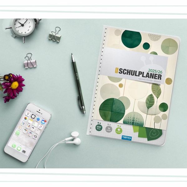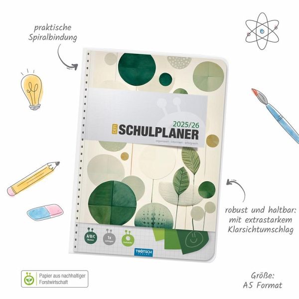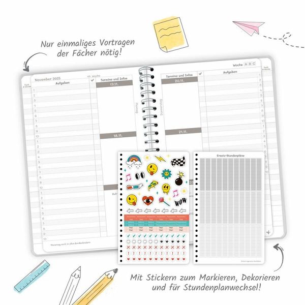 Der Schulplaner im DIN A5 Format mit extrastarkem Klarsichtumschlag ist mit einer Spiralbindung versehen, wodurch die Seiten leicht umgeblättert werden können. Auf einer Doppelseite pro Woche mit Kalendarium gibt es ausreichend Platz zum Eintragen von Aufgaben und Terminen. Durch die verkürzten Innenseiten ist ein nur einmaliges Vortragen der Fächer nötig. Stundenplanwechsel sind dank der ausreichend vorhandenen Ersatzsticker für die Schultagsfächer kein Problem. Darüber hinaus gibt es extra Seiten für Persönliches, Stundenpläne, Notenübersicht, Terminkalender, Schulferien, Notizen, Adressen, Geburtstage, Finanzplaner, Verleihliste und Jahreskalender. Weitere originelle Sticker sind perfekt zum individuellen Gestalten, zum Markieren, Sortieren und Dekorieren.