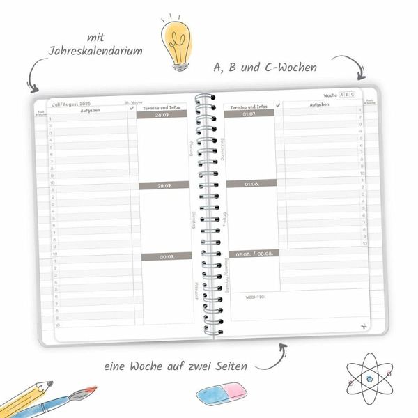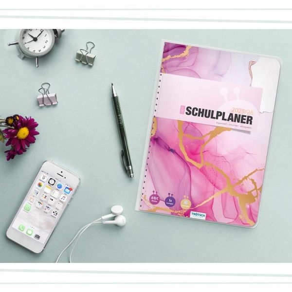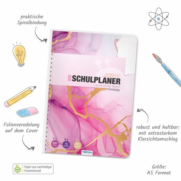 Der Schulplaner im DIN A5 Format mit extrastarkem Klarsichtumschlag ist mit einer Spiralbindung versehen, wodurch die Seiten leicht umgeblättert werden können. Auf einer Doppelseite pro Woche mit Kalendarium gibt es ausreichend Platz zum Eintragen von Aufgaben und Terminen. Durch die verkürzten Innenseiten ist ein nur einmaliges Vortragen der Fächer nötig. Stundenplanwechsel sind dank der ausreichend vorhandenen Ersatzsticker für die Schultagsfächer kein Problem. Darüber hinaus gibt es extra Seiten für Persönliches, Stundenpläne, Notenübersicht, Terminkalender, Schulferien, Notizen, Adressen, Geburtstage, Finanzplaner, Verleihliste und Jahreskalender. Weitere originelle Sticker sind perfekt zum individuellen Gestalten, zum Markieren, Sortieren und Dekorieren.