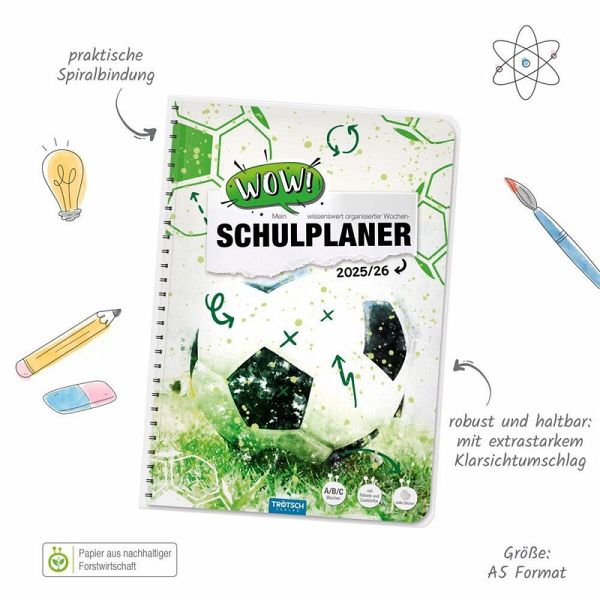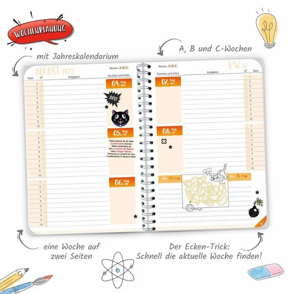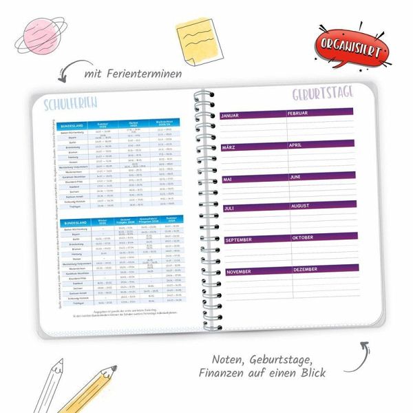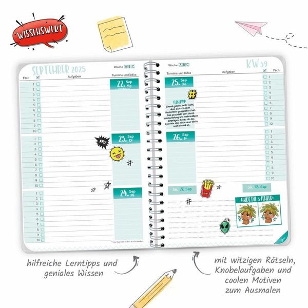 Mit dem bunten WOW-Schulplaner behält man immer den Überblick! Auf einer Doppelseite pro Woche mit Kalendarium gibt es ausreichend Platz zum Eintragen von Fächern, Aufgaben und Terminen. Außerdem hält der Planer hilfreiche Lerntipps, geniales Wissen, Rätsel und Knobelaufgaben bereit. Die originellen Sticker sind perfekt zum individuellen Gestalten, zum Markieren, Sortieren und Dekorieren. Darüber hinaus sind extra Seiten für Stundenpläne, Notenübersicht, Schulferien, Adressen, Geburtstage, Finanzplaner und Jahreskalender vorhanden. Dank der Spiralbindung lassen sich die Seiten leicht umblättern. Mit extra starkem Klarsichtumschlag!