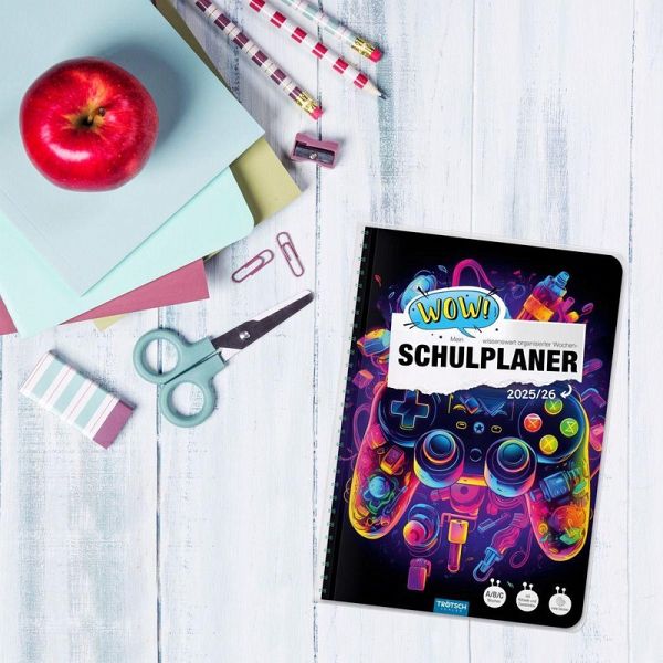 Mit dem bunten WOW-Schulplaner behält man immer den Überblick! Auf einer Doppelseite pro Woche mit Kalendarium gibt es ausreichend Platz zum Eintragen von Fächern, Aufgaben und Terminen. Außerdem hält der Planer hilfreiche Lerntipps, geniales Wissen, Rätsel und Knobelaufgaben bereit. Die originellen Sticker sind perfekt zum individuellen Gestalten, zum Markieren, Sortieren und Dekorieren. Darüber hinaus sind extra Seiten für Stundenpläne, Notenübersicht, Schulferien, Adressen, Geburtstage, Finanzplaner und Jahreskalender vorhanden. Dank der Spiralbindung lassen sich die Seiten leicht umblättern. Mit extra starkem Klarsichtumschlag!