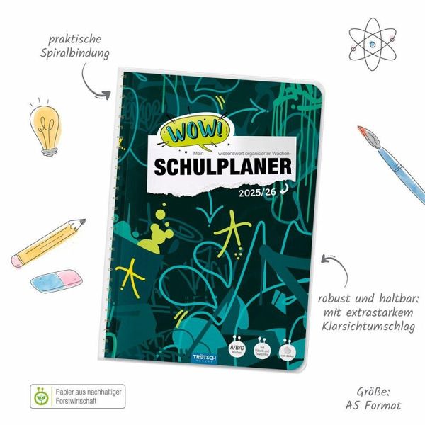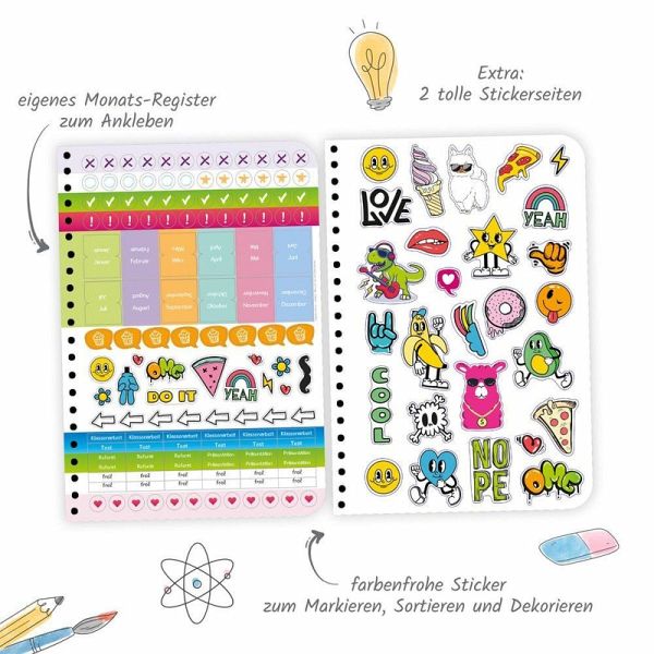Mit dem bunten WOW-Schulplaner behält man immer den Überblick! Auf einer Doppelseite pro Woche mit Kalendarium gibt es ausreichend Platz zum Eintragen von Fächern, Aufgaben und Terminen. Außerdem hält der Planer hilfreiche Lerntipps, geniales Wissen, Rätsel und Knobelaufgaben bereit. Die originellen Sticker sind perfekt zum individuellen Gestalten, zum Markieren, Sortieren und Dekorieren. Darüber hinaus sind extra Seiten für Stundenpläne, Notenübersicht, Schulferien, Adressen, Geburtstage, Finanzplaner und Jahreskalender vorhanden. Dank der Spiralbindung lassen sich die Seiten leicht umblättern. Mit extra starkem Klarsichtumschlag!