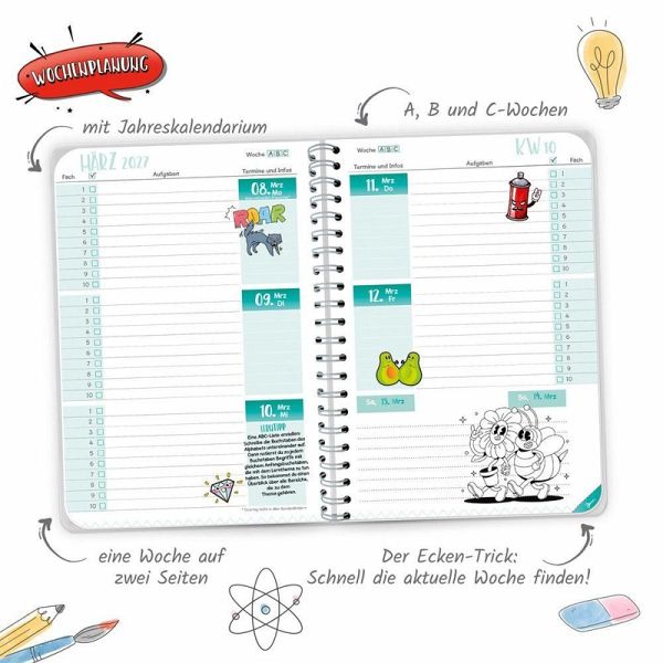Mit dem bunten WOW-Schulplaner behält man immer den Überblick! Auf einer Doppelseite pro Woche mit Kalendarium gibt es ausreichend Platz zum Eintragen von Fächern, Aufgaben und Terminen. Außerdem hält der Planer hilfreiche Lerntipps, geniales Wissen, Rätsel und Knobelaufgaben bereit. Die originellen Sticker sind perfekt zum individuellen Gestalten, zum Markieren, Sortieren und Dekorieren. Darüber hinaus sind extra Seiten für Stundenpläne, Notenübersicht, Schulferien, Adressen, Geburtstage, Finanzplaner und Jahreskalender vorhanden. Dank der Spiralbindung lassen sich die Seiten leicht umblättern. Mit extra starkem Klarsichtumschlag!