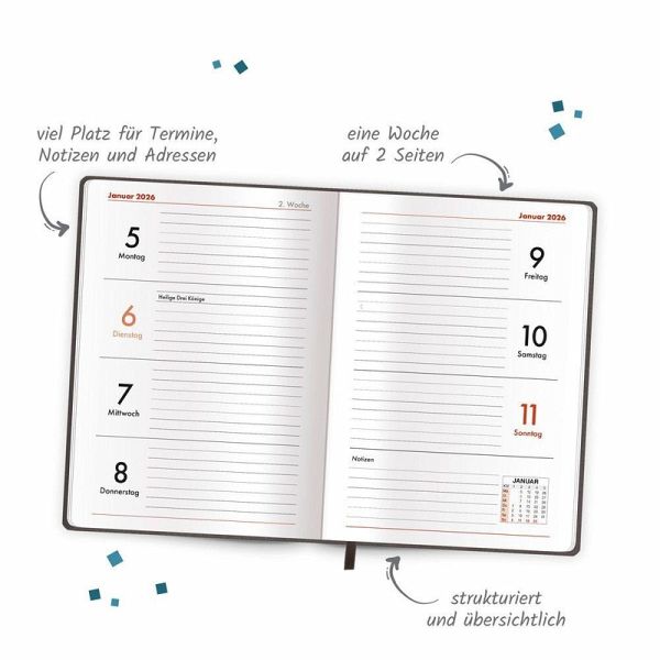 Der praktische Taschenkalender in A6-Format passt in jede Handtasche oder Aktenkoffer. Er besticht nicht nur mit seinem schlichten Design, sondern auch mit seinem übersichtlichen Kalendarium.