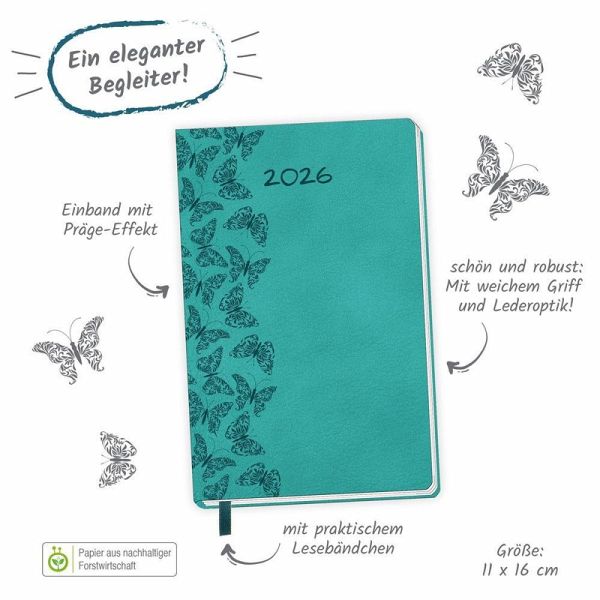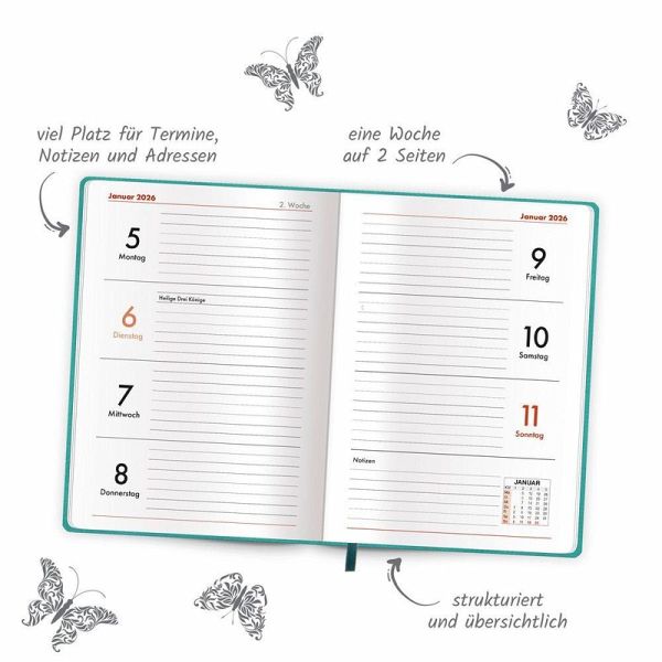 Der praktische Taschenkalender in A6-Format passt in jede Handtasche oder Aktenkoffer. Er besticht nicht nur mit seinem schlichten Design, sondern auch mit seinem übersichtlichen Kalendarium.