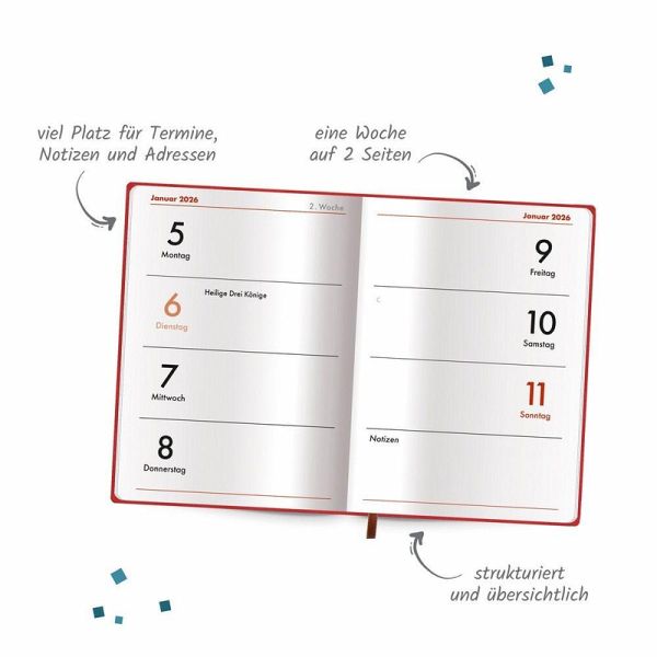 Der ideale kleine Begleiter! Mit der Übersicht von einer Woche auf zwei Seiten entfällt kein Termin mehr so leicht.
