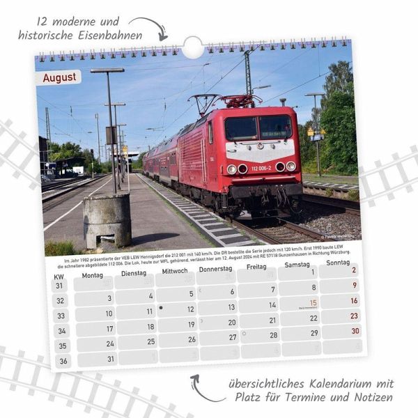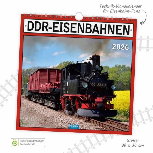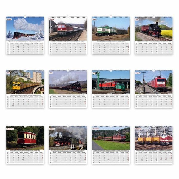 Ein DDR-Technikkalender mit faszinierenden historischen Aufnahmen wichtiger Eisenbahn-Modelle. Mit Bezeichnung, Jahr und Ortsbeschreibung. Dieser Bildkalender bietet ausreichend Platz für Termine und Notizen, mit Mondkalender, Feiertagen und Schulferienüberblick aller Bundesländer.