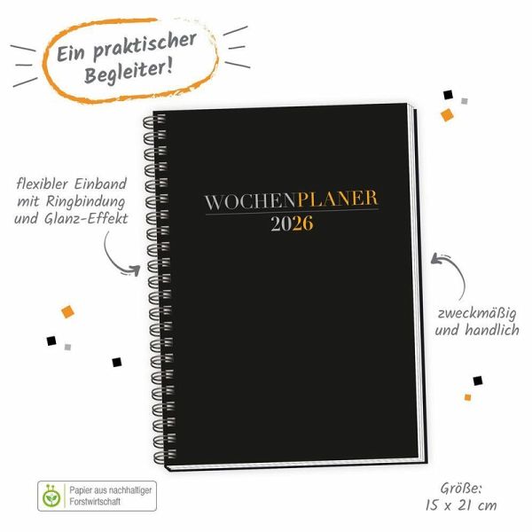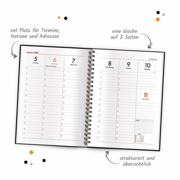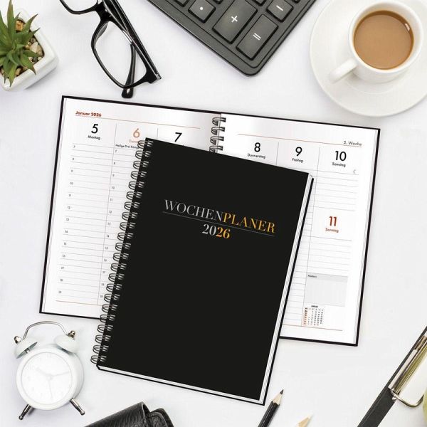 Dieser wunderschöne Wochenplaner mit Ringbindung überzeugt mit einem eleganten Design. Die übersichtliche Wochenansicht auf zwei Seiten bietet viel Platz zum Eintragen und Strukturieren von Terminen und Aufgaben. Dank Jahresübersicht, internationaler Telefonvorwahlen und Platz für Notizen und Adressen sind wichtige Informationen immer schnell bei der Hand. Gut gerüstet für das Jahr 2026!