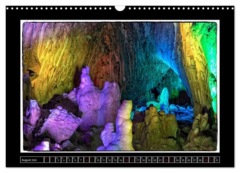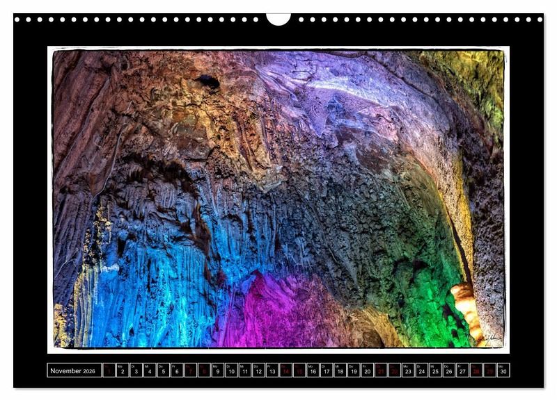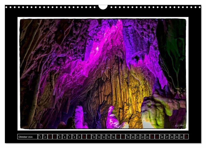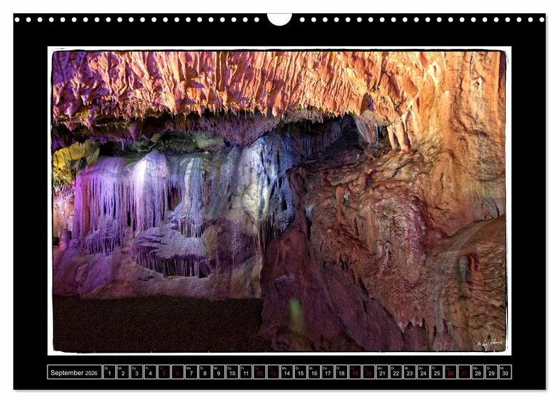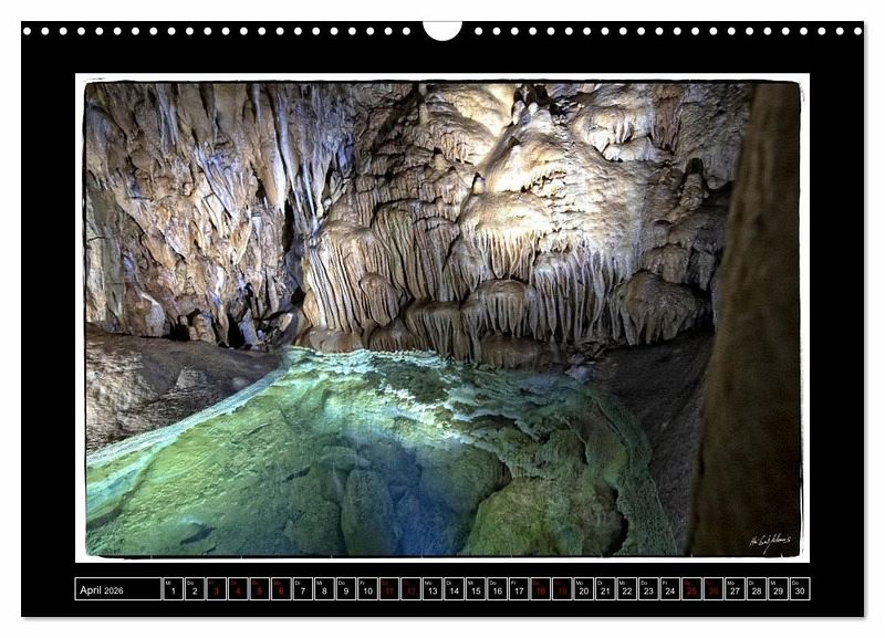 Tropfsteinhöhlen üben eine anhaltende Faszination auf und Menschen aus. Die Ausdauer und Gewaltigkeit der Natur ist nahezu atemberaubend. So auch die Dechenhöhle in Iserlon. Die bizarren steinernen Landschaften sind hier in ein kunstvolles Licht getaucht und fotografisch anmutend für diesen Kalender eingefangen worden.