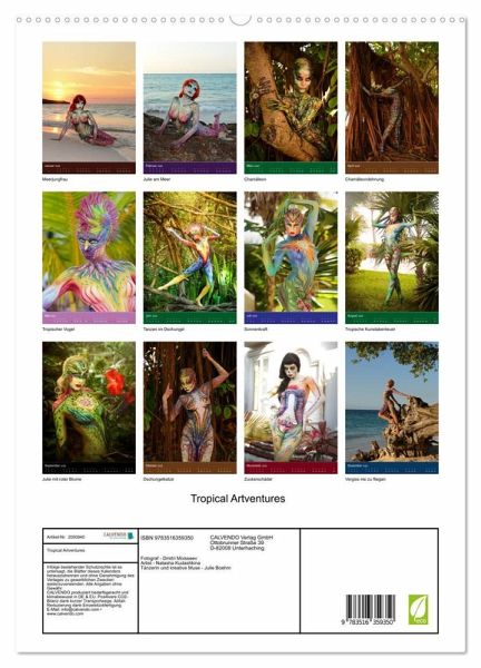 Künstlerin Natasha Kudaskina, Model Julie Boehm und Fotograf Dmitri Moisseev gehen auf eine farbenfrohe tropische Kunstreise nach Mexiko und Kuba. Wunderschöne Naturlandschaften und warme Sonne sind perfekt, um unglaubliche lebendige Kunstwerke zu schaffen. Dieser farbenfrohe Kalender lädt Sie ein, diese unglaubliche Reise durch eine Sammlung originaler Bodypainting-Kunstwerke zu teilen.