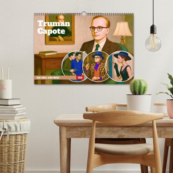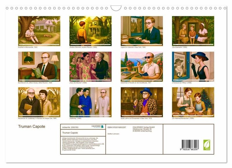 Er war einer der schillerndsten Schriftsteller des 20. Jahrhunderts: Truman Capote. Dieser Kalender führt durch Leben und Werk des Autors - vom exzentrischen Genie bis zum Welterfolg "Frühstück bei Tiffany". Die Motive im atmosphärischen Stil der 1960er-Jahre sind mal elegant, mal melancholisch und wurden von Steffani Lehmann mit Unterstützung einer KI editiert. Dieser weltweit erste Kalender zu Capote ist eine Hommage an einen Autor, der das Erzählen neu erfand und das Leben wie ein großes Theaterstück inszenierte.