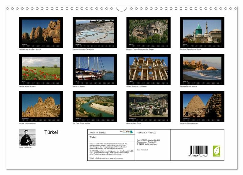 Die Türkei ist ein faszinierendes Land auf den zwei Kontinenten Europa und Asien. In Istanbul und Anatolien finden sich Spuren verschiedener Völker und Kulturen, zahlreiche bedeutende historische Stätten und atemberaubende Naturlandschaften. Dieser Wandkalender enthält 13 ausgewählte Fotografien mit Impressionen aus verschiedenen Regionen der Türkei.