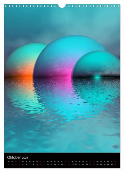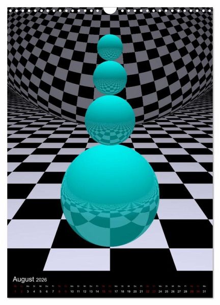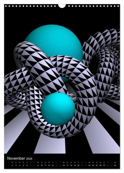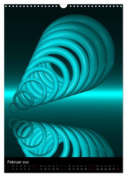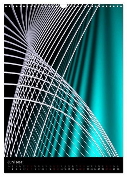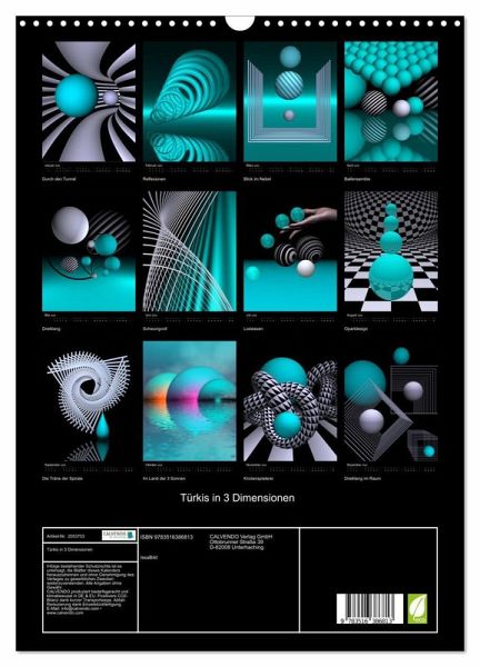 Ein eleganter Monatskalender mit schönen räumlichen Bildern überwiegend in den Farben türkis, weiß und schwarz.