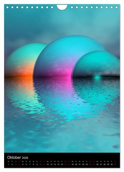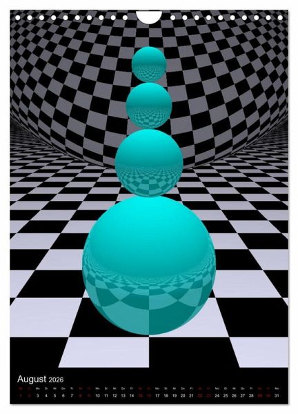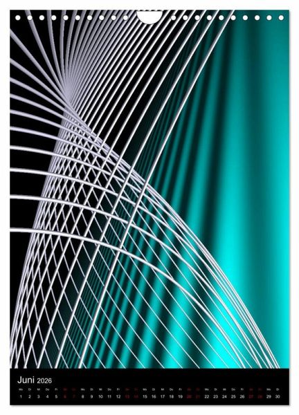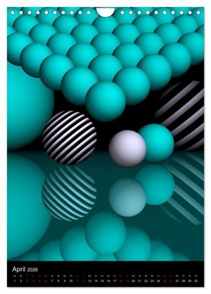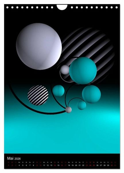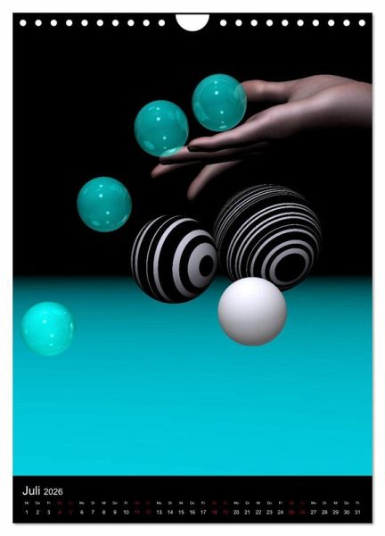 Ein eleganter Monatskalender mit schönen räumlichen Bildern überwiegend in den Farben türkis, weiß und schwarz.