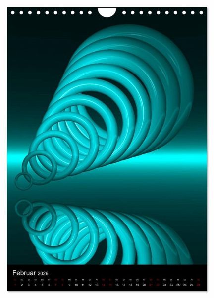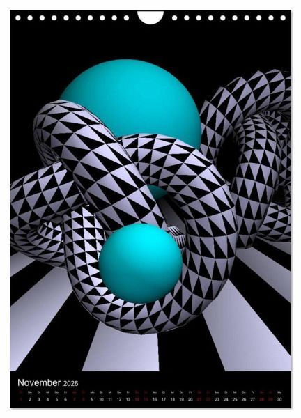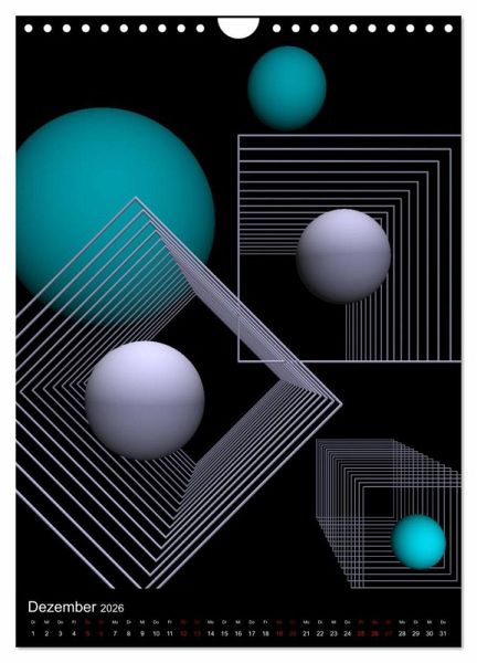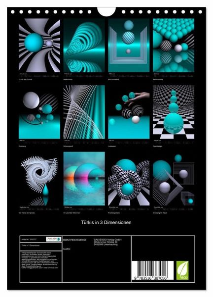 Türkis in 3 Dimensionen, geometrische Bilder begleiten Sie durch das Jahr. Ein eleganter Monatskalender mit schönen räumlichen Bildern überwiegend in den Farben türkis, weiß und schwarz.