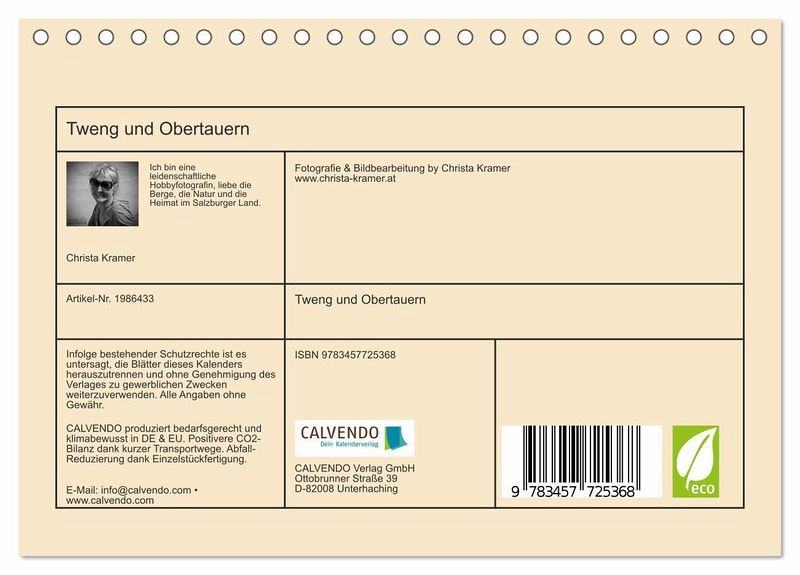 QUALITÄT - Hochwertiger Fotokalender mit 12 wunderschönen Motiven auf lichtbeständigem Bilderdruckpapier, robuste Spiralbindung.NACHHALTIG - deutliche Abfallreduzierung durch bedarfsgerechte Einzelstückfertigung, umweltfreundliches FSC-zertifiziertes Papier, Produktion in Deutschland, klimabewusste Logistik.PERFEKTES GESCHENK - Kalender für Freunde und Familie, für Kinder und Erwachsene, jung und alt, zu Weihnachten, Geburtstag oder zwischendurch.VIELFALT - Bildkalender in verschiedenen Formaten, z.B. DIN A5, DIN A4, DIN A3 sowie DIN A2. Ob Naturmotiv, Gemälde oder Fotos, ideal für ein persönliches Wohlfühlambiente.Traumhafte Ausflugsziele in Tweng und Obertauern von Autor(in): Christa Kramer