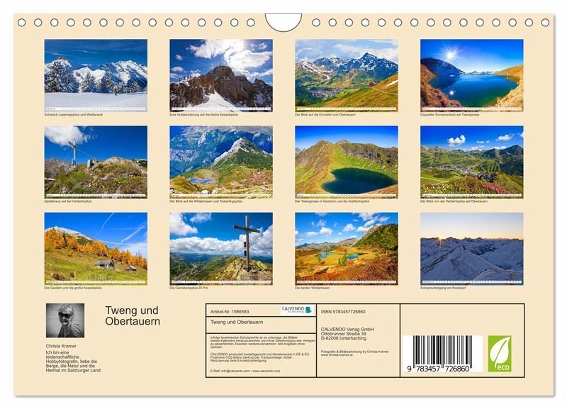 QUALITÄT - Hochwertiger Fotokalender mit 12 wunderschönen Motiven auf lichtbeständigem Bilderdruckpapier, robuste Spiralbindung mit Aufhängebügel.NACHHALTIG - deutliche Abfallreduzierung durch bedarfsgerechte Einzelstückfertigung, umweltfreundliches FSC-zertifiziertes Papier, Produktion in Deutschland, klimabewusste Logistik.PERFEKTES GESCHENK - Kalender für Freunde und Familie, für Kinder und Erwachsene, jung und alt, zu Weihnachten, Geburtstag oder zwischendurch.VIELFALT - Bildkalender in verschiedenen Formaten, z.B. DIN A5, DIN A4, DIN A3 sowie DIN A2. Ob Naturmotiv, Gemälde oder Fotos, ideal für ein persönliches Wohlfühlambiente.Traumhafte Ausflugsziele in Tweng und Obertauern von Autor(in): Christa Kramer