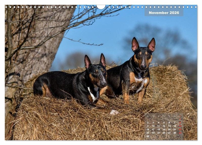 November: Zwei Bullterrier sitzen auf einem Heuballen