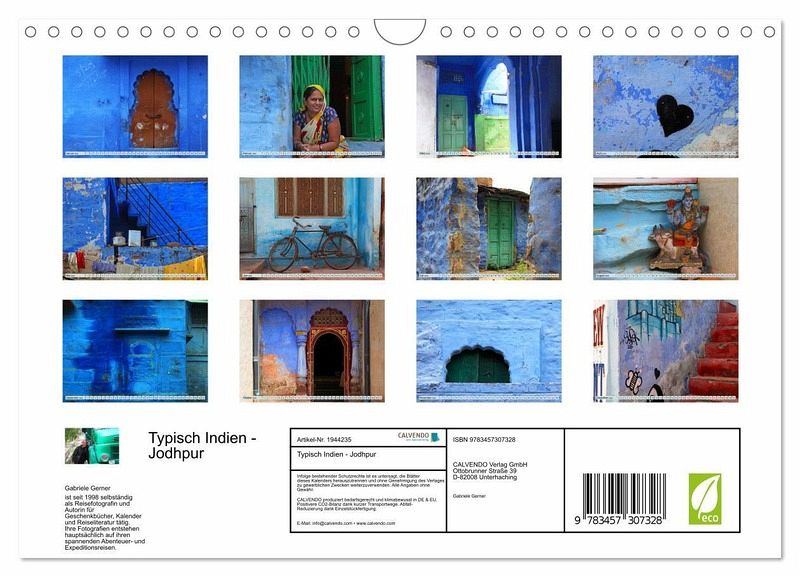 Mit "Typisch Indien - Jodhpur" präsentiert die Reisefotografin Gabriele Gerner die zauberhafte Welt der blauen Stadt Rajasthans, in der jedes Bild von Tradition und Geschichte erzählt. Die leuchtend blauen Häuser, für die Jodhpur weltberühmt ist, schaffen eine magische Kulisse. Die Fotografien fangen zudem die Schönheit der kunstvoll verzierten, jahrhundertealten Holztüren ein, die als stille Zeugen der Vergangenheit das Flair der alten Stadtviertel lebendig werden lassen. Lassen Sie sich von dieser besonderen Atmosphäre verzaubern und entdecken Sie das Herz Rajasthans in den farbenfrohen Details und authentischen Momenten, die Gabriele Gerner meisterhaft in ihren Bildern festgehalten hat - eine visuelle Reise voller Charme und kultureller Tiefe.