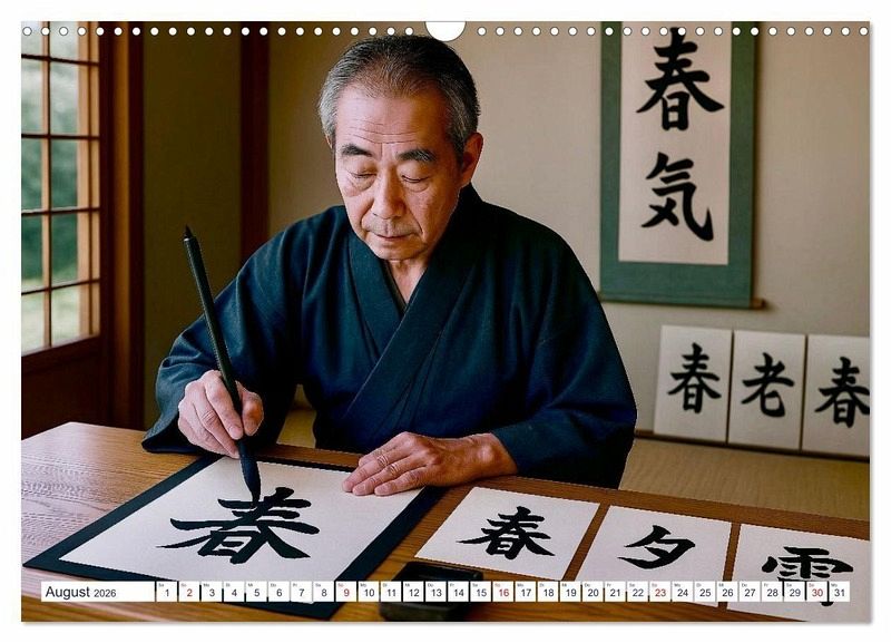 August: Ein Mann malt japanische Kalligraphie. Dansei ga Nihon no shod o egaite iru.