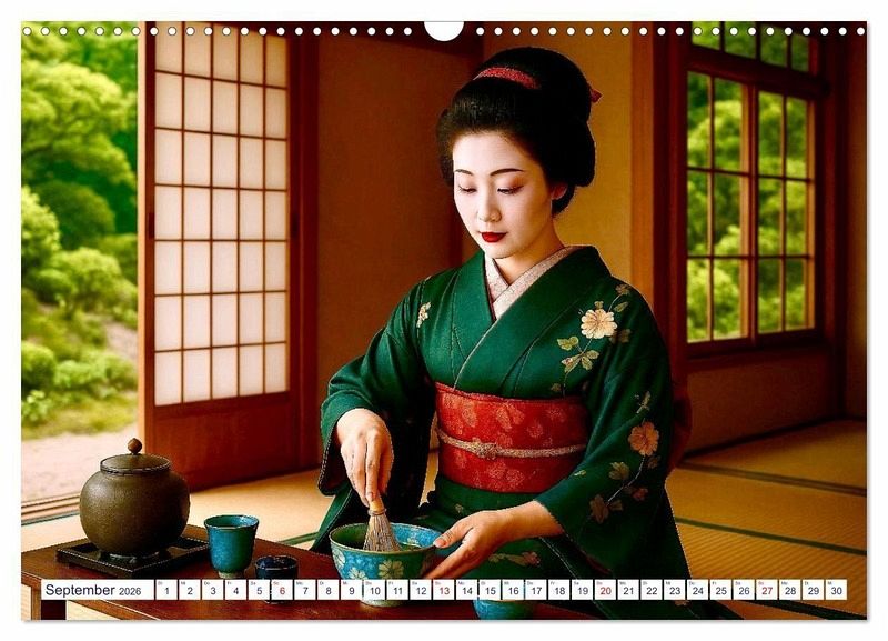 September: Eine Geisha bereitet die Teezeremonie zu. Geisha ga sad no junbi o shite iru.