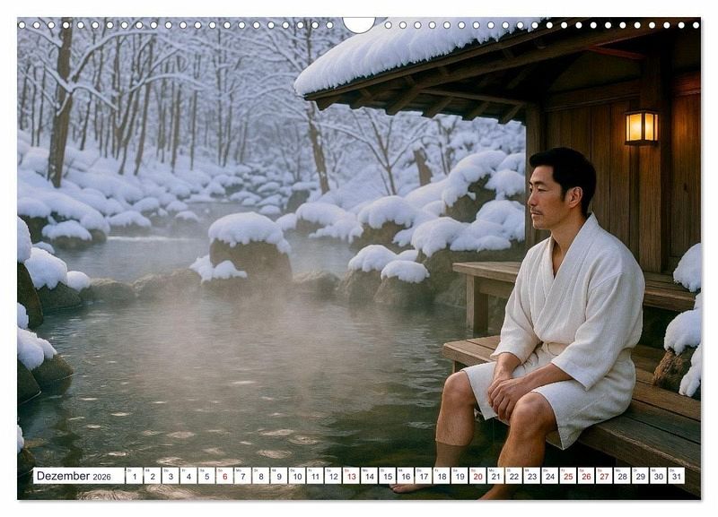 Dezember: Ein Mann entspannt im heißen Onsen. Dansei ga onsen de kutsuroide iru.