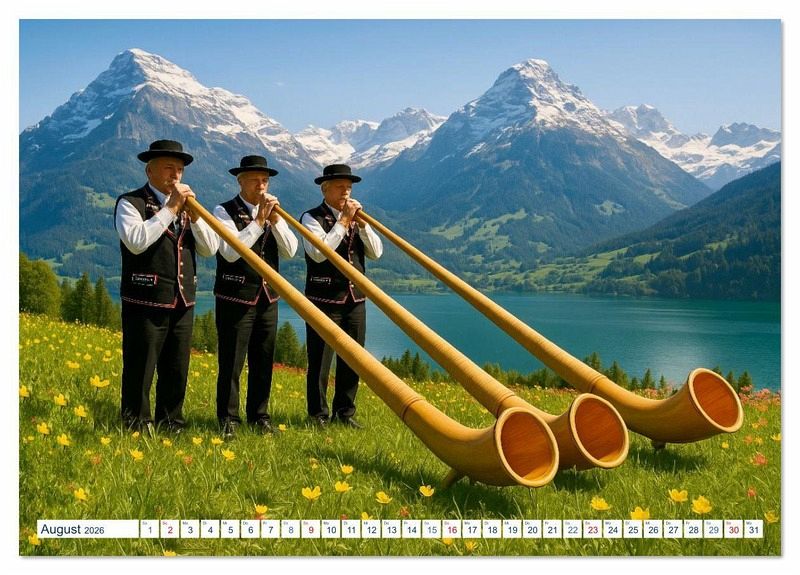 Entdecken Sie die Schweiz in ihrer ganzen Vielfalt: Von Alphornbläsern bis Uhrenhandwerk. Der Kalender zeigt abwechslungsreiche Bilder, die Steffani Lehmann mit Unterstützung einer KI editiert hat. Die Motive fangen das Herz der Schweiz(er) ein: authentisch, charmant und unverwechselbar.