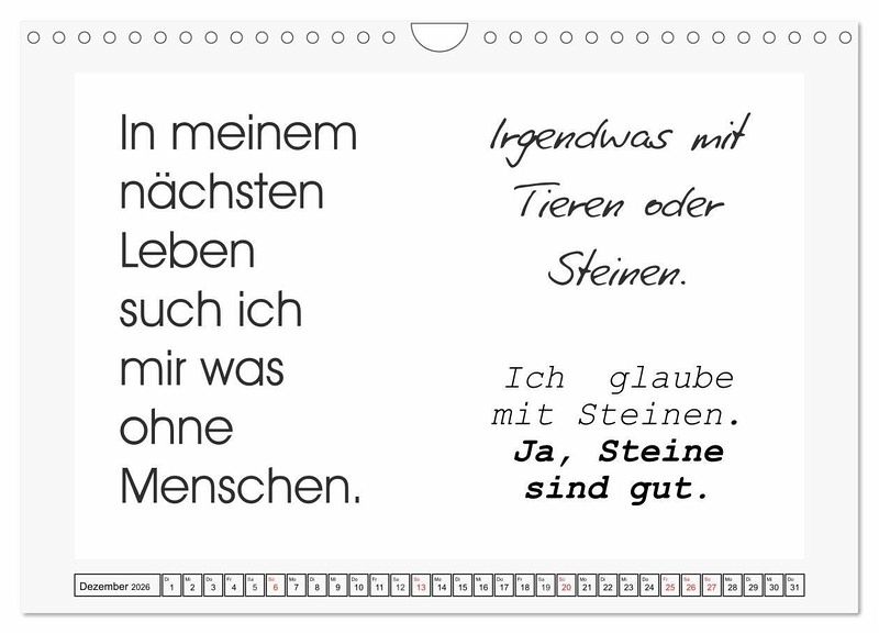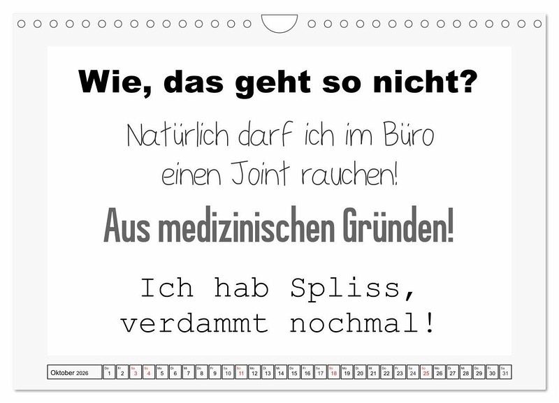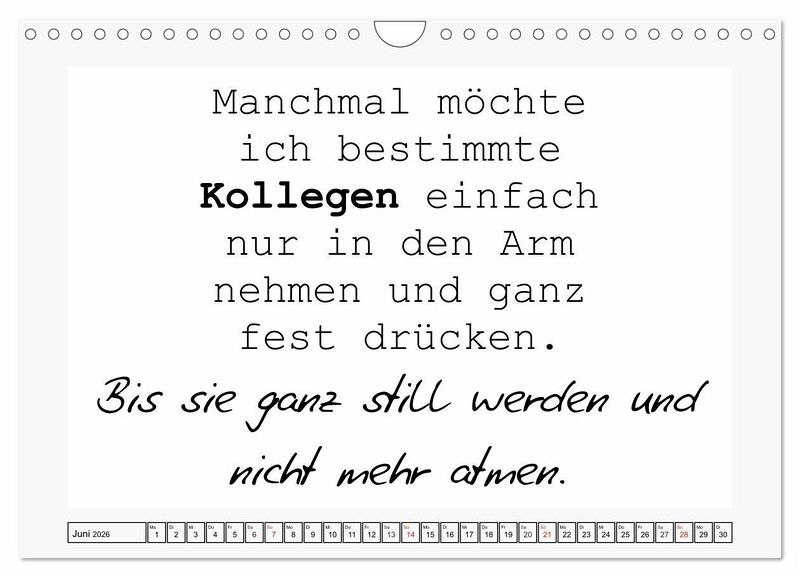 Sprüche für das Büro sind Kult! Sarkastisch, frech, und manchmal auch ziemlich fies. Dieser Kalender ist originell und cool gestaltet. Jeder Monat für sich ist schlicht gehalten, hat Platz für unzählige Notizen und sorgt für Lacher.