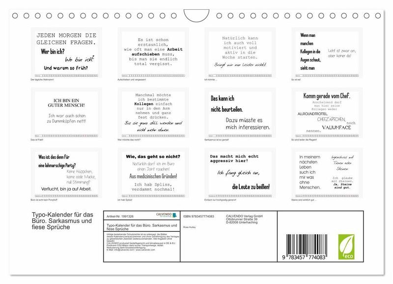 QUALITÄT - Hochwertiger Fotokalender mit 12 wunderschönen Motiven auf lichtbeständigem Bilderdruckpapier, robuste Spiralbindung mit Aufhängebügel.NACHHALTIG - deutliche Abfallreduzierung durch bedarfsgerechte Einzelstückfertigung, umweltfreundliches FSC-zertifiziertes Papier, Produktion in Deutschland, klimabewusste Logistik.PERFEKTES GESCHENK - Kalender für Freunde und Familie, für Kinder und Erwachsene, jung und alt, zu Weihnachten, Geburtstag oder zwischendurch.VIELFALT - Bildkalender in verschiedenen Formaten, z.B. DIN A5, DIN A4, DIN A3 sowie DIN A2. Ob Naturmotiv, Gemälde oder Fotos, ideal für ein persönliches Wohlfühlambiente.Trendiger Sprüchekalender für den Arbeitsplatz von Autor(in): Rose Hurley