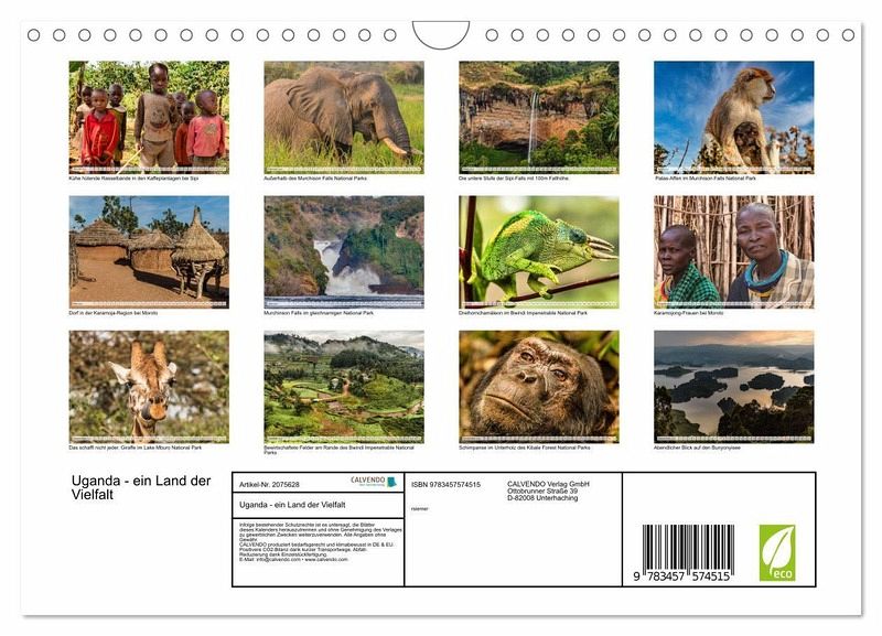 QUALITÄT - Hochwertiger Fotokalender mit 12 wunderschönen Motiven auf lichtbeständigem Bilderdruckpapier, robuste Spiralbindung mit Aufhängebügel.NACHHALTIG - deutliche Abfallreduzierung durch bedarfsgerechte Einzelstückfertigung, umweltfreundliches FSC-zertifiziertes Papier, Produktion in Deutschland, klimabewusste Logistik.PERFEKTES GESCHENK - Kalender für Freunde und Familie, für Kinder und Erwachsene, jung und alt, zu Weihnachten, Geburtstag oder zwischendurch.VIELFALT - Bildkalender in verschiedenen Formaten, z.B. DIN A5, DIN A4, DIN A3 sowie DIN A2. Ob Naturmotiv, Gemälde oder Fotos, ideal für ein persönliches Wohlfühlambiente.Uganda bietet eine Vielfalt an Menschen, Landschaften, Fauna und Flora von Autor(in): rsiemer
