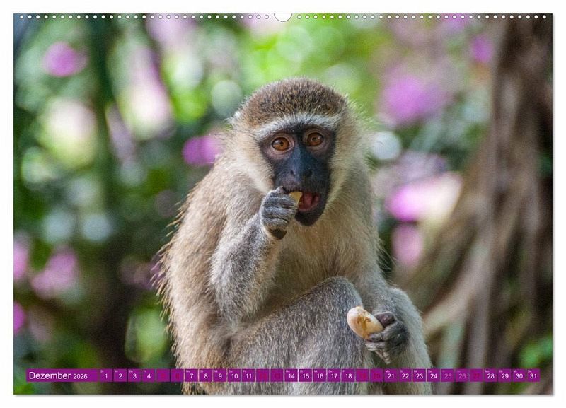 Dezember: Grünmeerkatze - Pause unter blühenden Bäumen