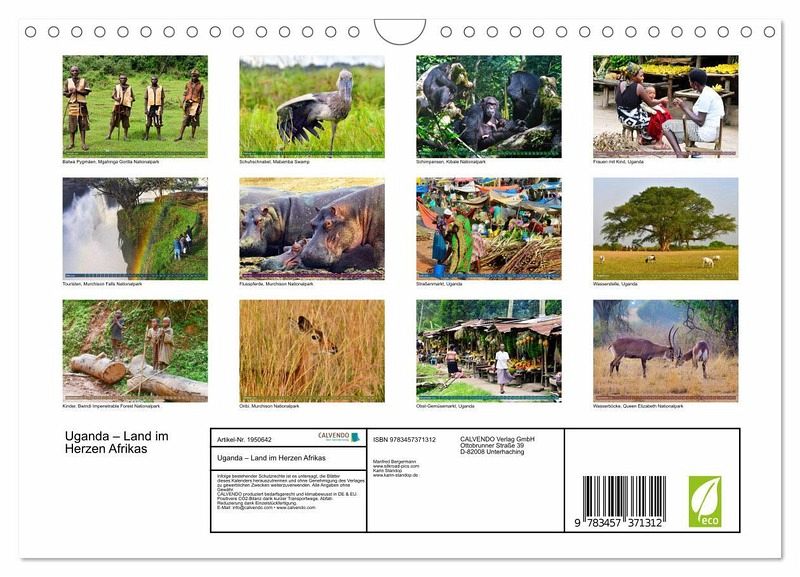 QUALITÄT - Hochwertiger Fotokalender mit 12 wunderschönen Motiven auf lichtbeständigem Bilderdruckpapier, robuste Spiralbindung mit Aufhängebügel.NACHHALTIG - deutliche Abfallreduzierung durch bedarfsgerechte Einzelstückfertigung, umweltfreundliches FSC-zertifiziertes Papier, Produktion in Deutschland, klimabewusste Logistik.PERFEKTES GESCHENK - Kalender für Freunde und Familie, für Kinder und Erwachsene, jung und alt, zu Weihnachten, Geburtstag oder zwischendurch.VIELFALT - Bildkalender in verschiedenen Formaten, z.B. DIN A5, DIN A4, DIN A3 sowie DIN A2. Ob Naturmotiv, Gemälde oder Fotos, ideal für ein persönliches Wohlfühlambiente.Uganda, ein Land mit einer herausragenden Natur und vielen Ethnien. von Autor(in): Manfred Bergermann