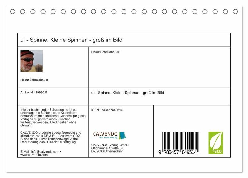 QUALITÄT - Hochwertiger Fotokalender mit 12 wunderschönen Motiven auf lichtbeständigem Bilderdruckpapier, robuste Spiralbindung.NACHHALTIG - deutliche Abfallreduzierung durch bedarfsgerechte Einzelstückfertigung, umweltfreundliches FSC-zertifiziertes Papier, Produktion in Deutschland, klimabewusste Logistik.PERFEKTES GESCHENK - Kalender für Freunde und Familie, für Kinder und Erwachsene, jung und alt, zu Weihnachten, Geburtstag oder zwischendurch.VIELFALT - Bildkalender in verschiedenen Formaten, z.B. DIN A5, DIN A4, DIN A3 sowie DIN A2. Ob Naturmotiv, Gemälde oder Fotos, ideal für ein persönliches Wohlfühlambiente.Ein Querschnitt heimischer Spinnen im Miniformat - bunt und eher lustig, aber gar nicht ekelig. von Autor(in): Heinz Schmidbauer