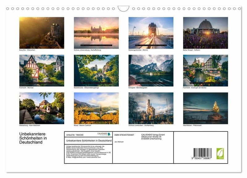 QUALITÄT - Hochwertiger Fotokalender mit 12 wunderschönen Motiven auf lichtbeständigem Bilderdruckpapier, robuste Spiralbindung mit Aufhängebügel.NACHHALTIG - deutliche Abfallreduzierung durch bedarfsgerechte Einzelstückfertigung, umweltfreundliches FSC-zertifiziertes Papier, Produktion in Deutschland, klimabewusste Logistik.PERFEKTES GESCHENK - Kalender für Freunde und Familie, für Kinder und Erwachsene, jung und alt, zu Weihnachten, Geburtstag oder zwischendurch.VIELFALT - Bildkalender in verschiedenen Formaten, z.B. DIN A5, DIN A4, DIN A3 sowie DIN A2. Ob Naturmotiv, Gemälde oder Fotos, ideal für ein persönliches Wohlfühlambiente.Deutschlands verborgene Perlen: Kalender voller Schönheit von Autor(in): Jan Wehnert
