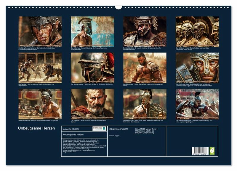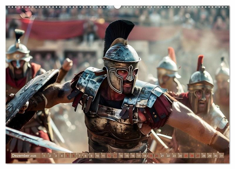 Ein Kalender, der die Essenz der antiken Kämpfer einfängt, wie sie niemand zuvor gesehen hat. Entdecken Sie die Kraft, Würde und den unerschütterlichen Mut der antiken Gladiatoren, neu interpretiert durch die Energie moderner KI-Kunst. Jeder Monat offenbart ein ausdrucksvolles Portrait, das die Stärke und Menschlichkeit dieser historischen Kämpfer würdigt und die Geschichten ihrer unbeugsamen Herzen erzählt. Lassen Sie sich von ihrer Entschlossenheit und Stärke durch das Jahr begleiten. Ein Kalender, der Vergangenheit und Zukunft in einzigartigen Bildern vereint.