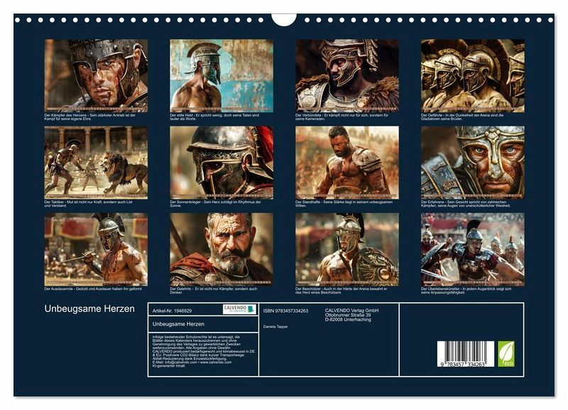 Ein Kalender, der die Essenz der antiken Kämpfer einfängt, wie sie niemand zuvor gesehen hat. Entdecken Sie die Kraft, Würde und den unerschütterlichen Mut der antiken Gladiatoren, neu interpretiert durch die Energie moderner KI-Kunst. Jeder Monat offenbart ein ausdrucksvolles Portrait, das die Stärke und Menschlichkeit dieser historischen Kämpfer würdigt und die Geschichten ihrer unbeugsamen Herzen erzählt. Lassen Sie sich von ihrer Entschlossenheit und Stärke durch das Jahr begleiten. Ein Kalender, der Vergangenheit und Zukunft in einzigartigen Bildern vereint.