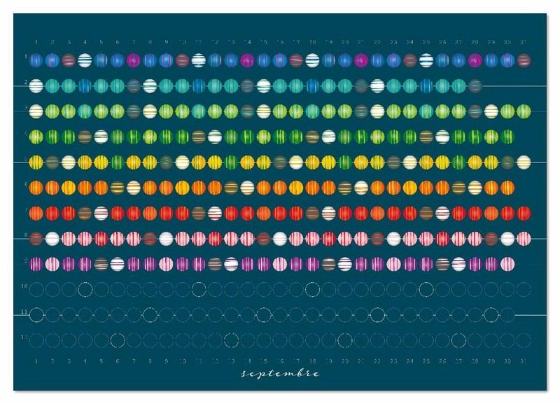 Ce calendrier de perles unique et individuel décore chaque mur avec son design esthétique et simple de perles sur fond sombre. Chaque mois = une rangée de perles. Les perles grises représentent les samedis et les perles blanches les dimanches.Sur chaque feuille du mois, on a en même temps un aperçu de l'année, car les cercles encore sombres et non remplis sont les jours des mois à venir sur les autres feuilles du calendrier. Les dimanches sont marqués par des anneaux blancs et un "S". Chaque perle du mercredi est conçue dans le schéma de couleurs inversé par rapport aux autres perles des jours de la semaine.Ce calendrier est renouvelé chaque année et peut devenir un objet fixe de votre intérieur. C'est aussi un cadeau idéal !