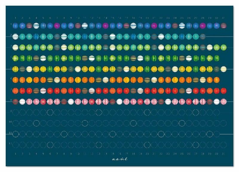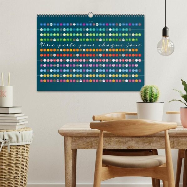 Ce calendrier de perles unique et individuel décore chaque mur avec son design esthétique et simple de perles sur fond sombre. Chaque mois = une rangée de perles. Les perles grises représentent les samedis et les perles blanches les dimanches.Sur chaque feuille du mois, on a en même temps un aperçu de l'année, car les cercles encore sombres et non remplis sont les jours des mois à venir sur les autres feuilles du calendrier. Les dimanches sont marqués par des anneaux blancs et un "S". Chaque perle du mercredi est conçue dans le schéma de couleurs inversé par rapport aux autres perles des jours de la semaine.Ce calendrier est renouvelé chaque année et peut devenir un objet fixe de votre intérieur. C'est aussi un cadeau idéal !