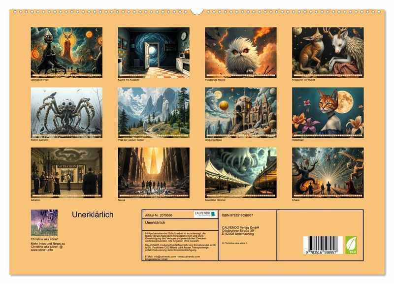 Tauchen Sie ein in eine faszinierende Welt zwischen Traum und Albtraum - mit diesem außergewöhnlichen Wandkalender von Christine aka stine1. Unerklärlich präsentiert 12 KI-generierte Kunstwerke, die ebenso bizarr wie beeindruckend sind. Ob mystisch, unheimlich oder einfach nur wundersam - jeder Monat überrascht mit einem neuen surrealen Highlight. Ideal für alle, die das Außergewöhnliche lieben und sich gerne von Kunst zum Staunen bringen lassen. Ein echter Hingucker für Zuhause oder das Büro!