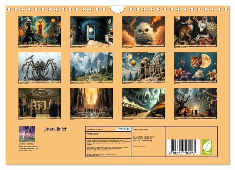 Tauchen Sie ein in eine faszinierende Welt zwischen Traum und Albtraum - mit diesem außergewöhnlichen Wandkalender von Christine aka stine1. Unerklärlich präsentiert 12 KI-generierte Kunstwerke, die ebenso bizarr wie beeindruckend sind. Ob mystisch, unheimlich oder einfach nur wundersam - jeder Monat überrascht mit einem neuen surrealen Highlight. Ideal für alle, die das Außergewöhnliche lieben und sich gerne von Kunst zum Staunen bringen lassen. Ein echter Hingucker für Zuhause oder das Büro!