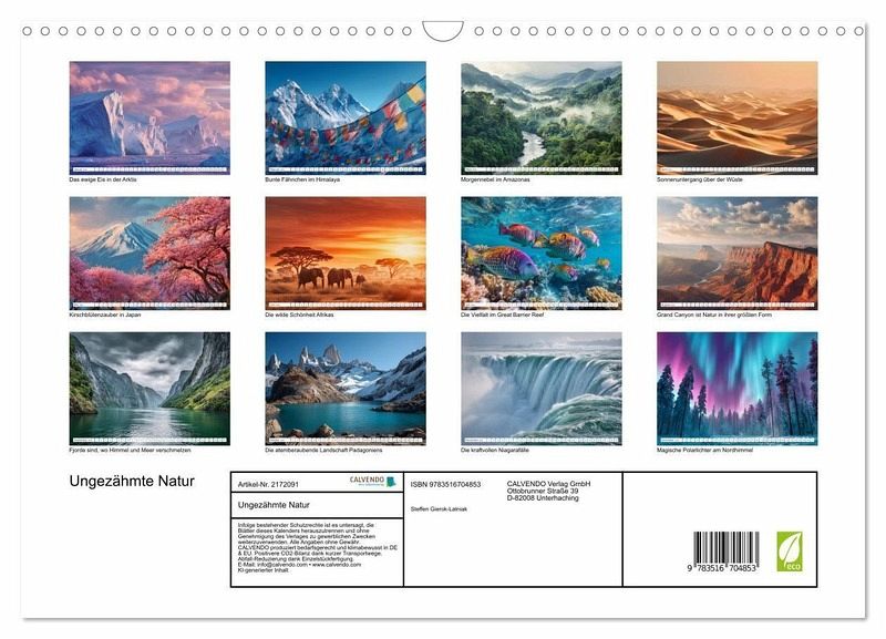 Lass dich jeden Monat aufs Neue verzaubern! Der Kalender Naturwunder der Erde entführt dich zu den spektakulärsten Landschaften unseres Planeten. Erlebe atemberaubende Berge, unendliche Ozeane, mystische Wälder und die wildesten Nationalparks der Welt. Ein Geschenk voller Fernweh, Inspiration und Schönheit - perfekt für Naturfreunde, Reiseliebhaber und alle, die sich täglich an der Kraft der Erde erfreuen möchten. Alle hier gezeigten Illustrationen wurden mit Sorgfalt, Liebe und mit Hilfe einer KI generiert. Abschließend werden sie mit Bildbearbeitungsprogrammen überarbeitet und in den Kalender eingefügt.