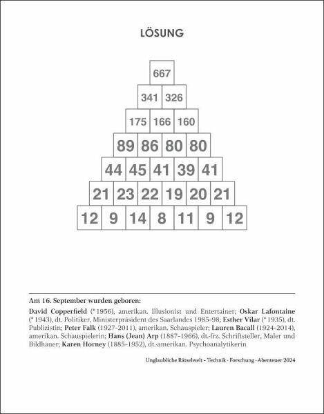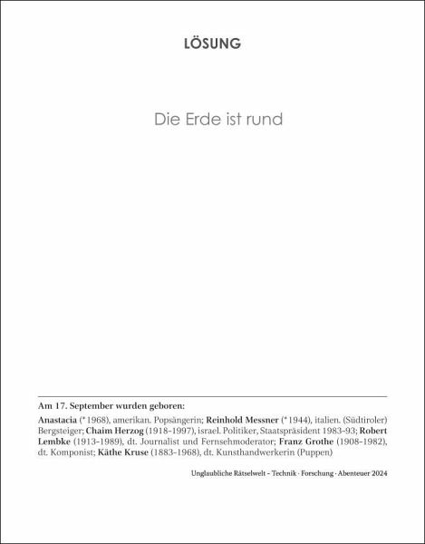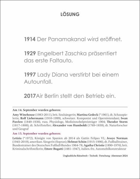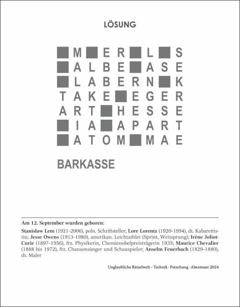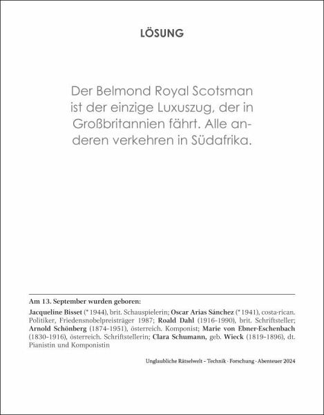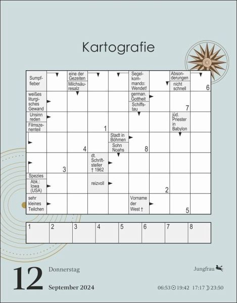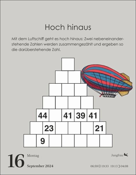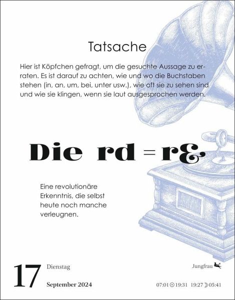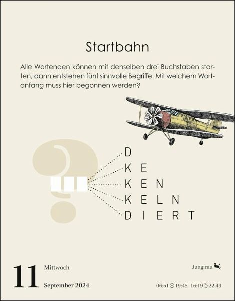 - Rätsel im Retro-Look: Ein Ausflug in die weite Rätselwelt im brandneuen Abreißkalender 2024 - Täglich neuer Tüftelstoff: Rätselkalender mit allem, was echte Knobler glücklich macht, vom vertrackten Zahlenrätsel bis hin zum unterhaltsamen Logikrätsel- Technik, Forschung, Abenteuer: Tageskalender mit neuen spannenden Rätseln für Erwachsene, die ganz nebenbei in faszinierende Wissensgebiete entführen- Unaufdringliches Design mit Steampunk-Elementen: Geeignet als Tischkalender oder Kalender zum Aufstellen, im kompakten Format 12,5 x 16 cm- Mit jedem Tag ein bisschen schlauer: Die Tagesabreißkalender von Harenberg aus dem Athesia Kalenderverlag.Jeden Tag ein bisschen schlauer: Wissenskalender von HarenbergEinmal am Tag die grauen Zellen in Schwung bringen oder über kuriose Fakten schmunzeln: Mit den kleinen Kalendern zum Aufstellen oder Aufhängen ist das nächste Wissenshäppchen immer nur ein Kalenderblatt entfernt. Die Tageskalender sind daher ein wertvoller Begleiter durch das Jahrund das ideale Geschenk für wissbegierige Menschen. Sie bieten nicht nur spannende Fragen und informative Antworten aus den unterschiedlichsten Wissensgebieten, sondern auch Rätsel und Denksportaufgaben, Fun-Facts und Aha-Momente. Von A wie Alltagswissen bis Z wie Zitate: Stellen Sie Ihr Wissen auf die Probe mit den Tagesabreißkalendern von Harenberg!