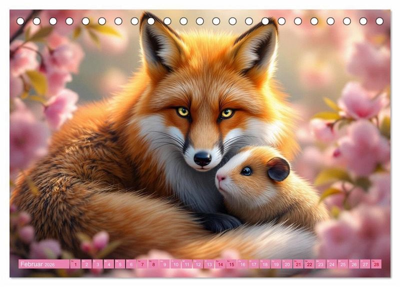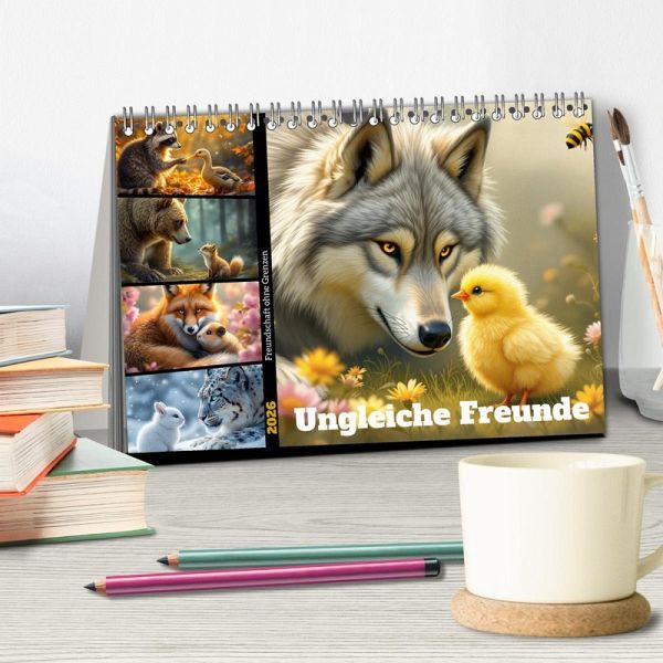 Erleben Sie die magische Welt von ungleichen Tierfreundschaften. In diesem mit Hilfe von KI erstellten Familienkalender finden Sie 12 Monate voller herzlicher Momente, die Sie mit Ihren Liebsten teilen möchten. Ob Wolf, Maus, Katze oder Kojote, die Freundschaften überwinden Grenzen.