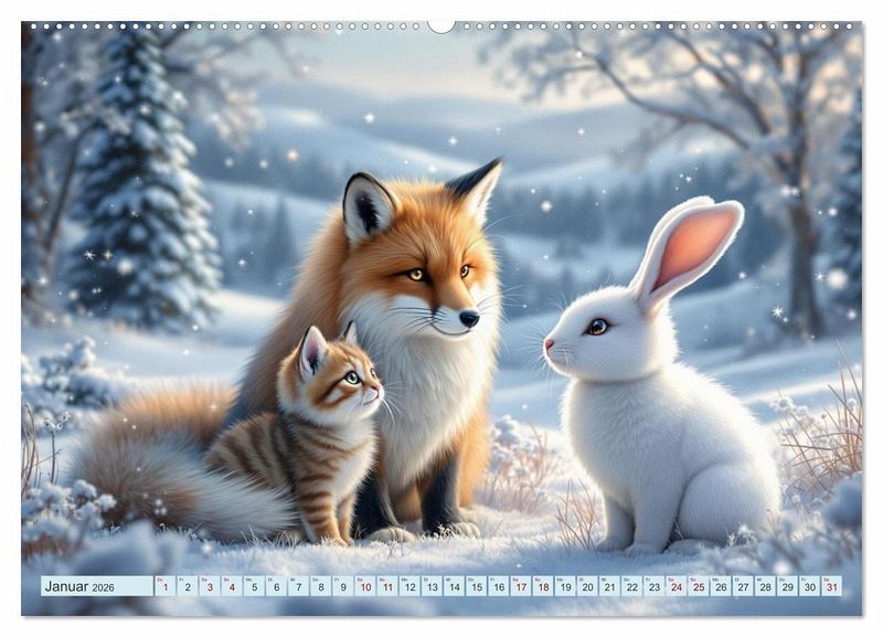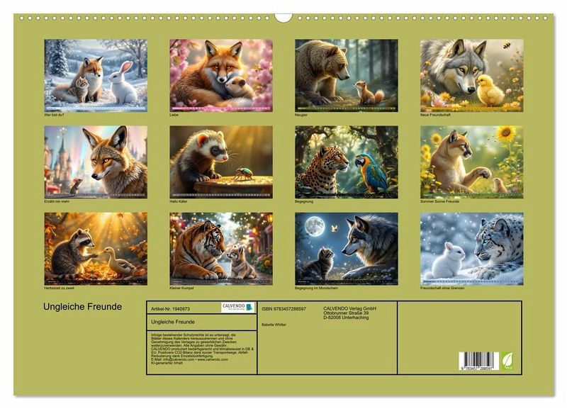 Erleben Sie die magische Welt von ungleichen Tierfreundschaften. In diesem mit Hilfe von KI erstellten Familienkalender finden Sie 12 Monate voller herzlicher Momente, die Sie mit Ihren Liebsten teilen möchten. Ob Wolf, Maus, Katze oder Kojote, die Freundschaften überwinden Grenzen.
