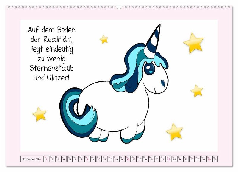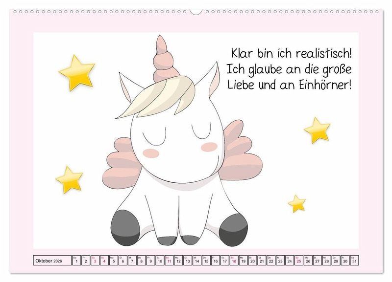 Ein niedlicher Typo-Kalender mit Einhorn-Affirmationen und Lebensweisheiten für mehr Lebensfreude und gute Laune. Dieser lustige Kalender bringt positive Schwingungen in das Zuhause und zaubert ein Schmunzeln auf die Gesichter. Absichtlich schlicht gehalten, bietet dieser Kalender auch genügend Platz für Notizen und er eignet sich natürlich als humorvolles Geschenk.